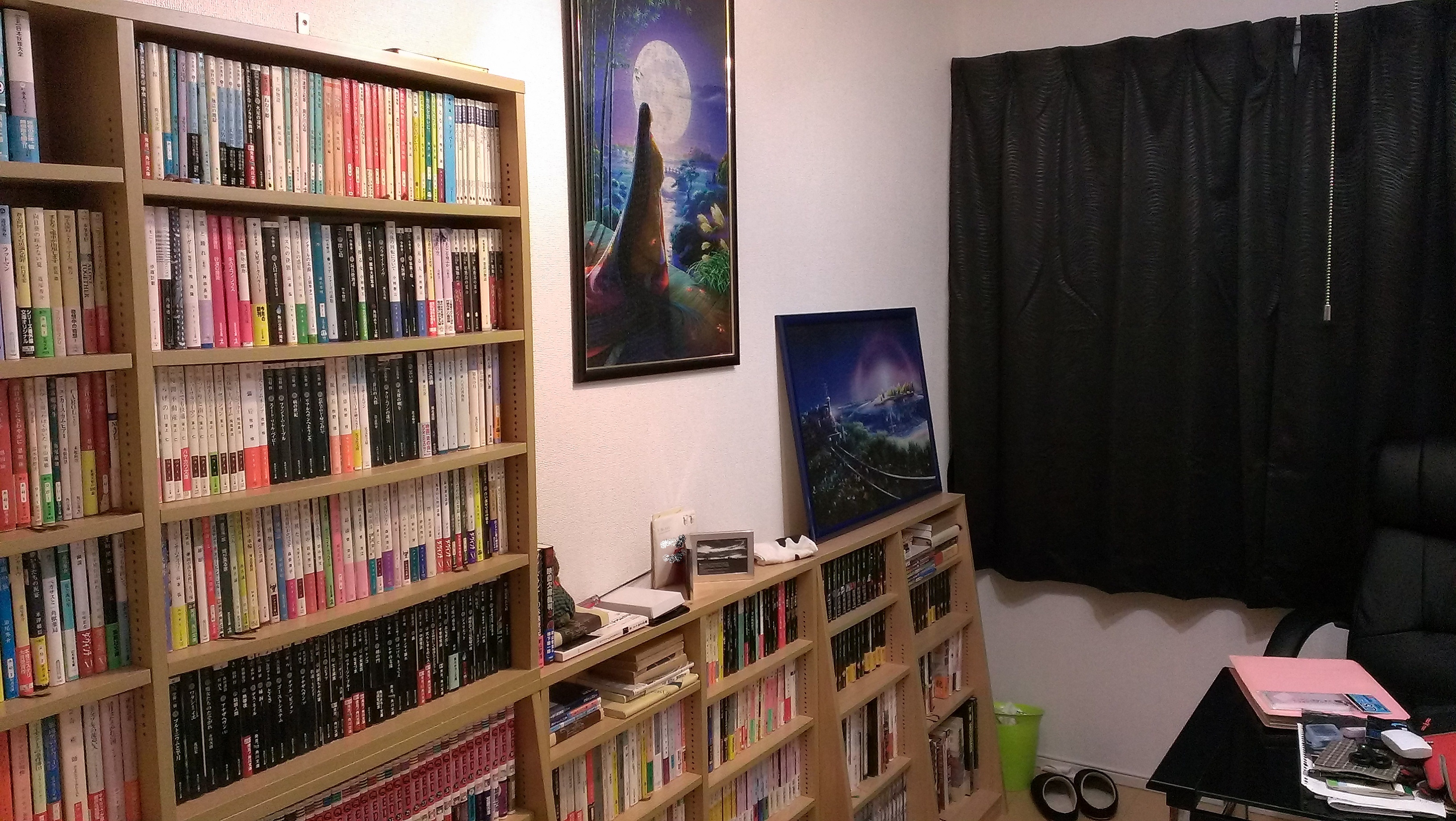 本棚は実家からこらせっせと担いできたもの。3往復してようやく整えました。四畳半では見上げるように感じていたものが、六畳間(新築)に運び込まれると、あら不思議。ずいぶんと背が低く感じるのです。蔵書はどれもこれも埃をかぶっていて、厭ですねぇ。